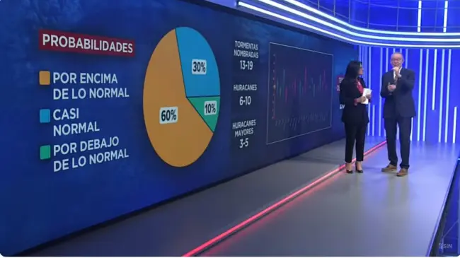 Durante su intervención junto a la periodista Alicia Ortega en el especial En el ojo en el huracán, el experto John Morales explicó: “Lo que están viendo aquí es la probabilidad de que la temporada sea activa, un 60 %, un 30 % de que sea normal y solo un 10 % de que sea menos activa de lo normal. Si sumamos el casi normal con el por encima del normal, nos da un 90 %”.