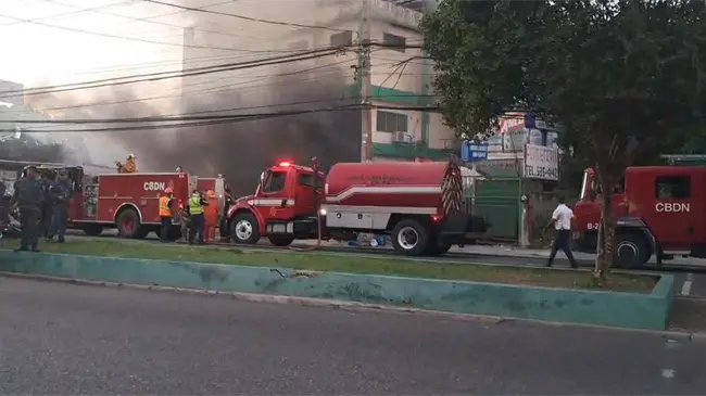 Varias unidades del Cuerpo de Bomberos del Distrito Nacional trabajan para sofocar un incendio registrado la tarde de este viernes en la Ferretería San Miguel, ubicada en el kilómetro 7½ de la prolongación avenida Independencia.