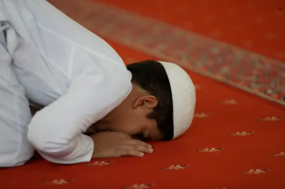 La misma maestra, de la que solo se ven las piernas, parece luego pisar sobre las alfombrillas y cerca de las manos de uno de los chicos que practicaba sus oraciones islámicas.