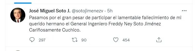 “Pasamos por el gran pesar de participar el lamentable fallecimiento de mi querido hermano el General Ingeniero Freddy Ney Soto Jiménez Cariñosamente Cuchico”, escribió.