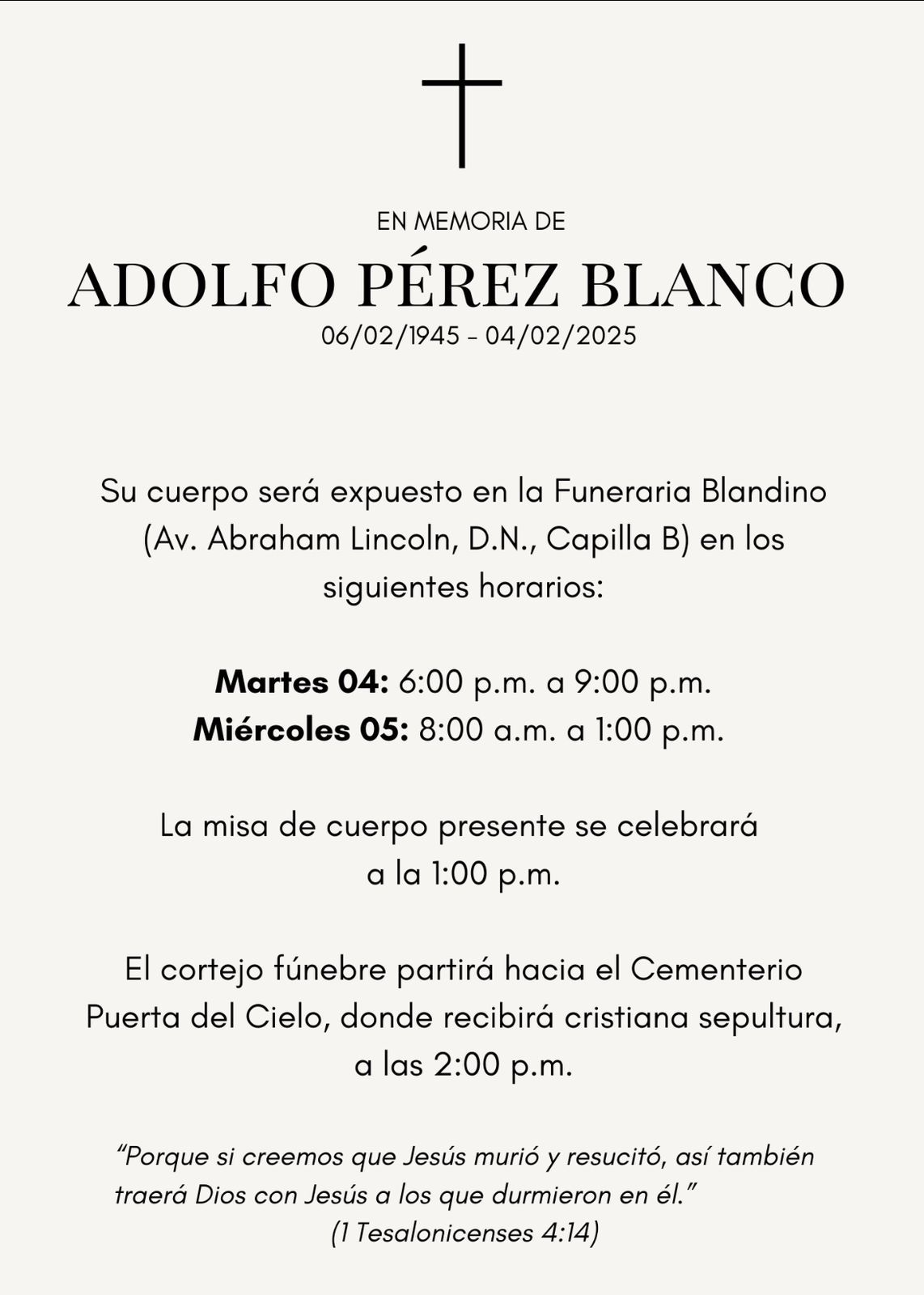 Santo Domingo.– La mañana de este martes falleció el empresario Rafael Adolfo Pérez Blanco, padre del dirigente político y director del Programa de Medicamentos Esenciales y Central de Apoyo Logístico (PROMESE/CAL), Adolfo Pérez.