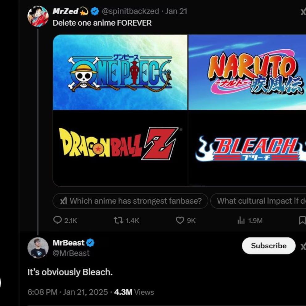 REDACCIÓN.– Redacción.- El creador de contenido MrBeast generó del debate entre los fans del "Bleach", luego de responder a una preunta de X realizada por el usuario MrZed quien planteó la posibilidad de eliminar un anime para siempre entre One Piece, Naruto, Dragon Ball Z y Bleach.