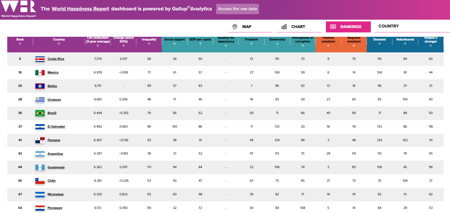 Entre los más felices de la región se posicionan Costa Rica, México, Uruguay, Brasil, El Salvador, Panamá, Argentina, Guatemala, Chile, Nicaragua, Paraguay, Colombia, Ecuador, Honduras, Perú, entre otros.