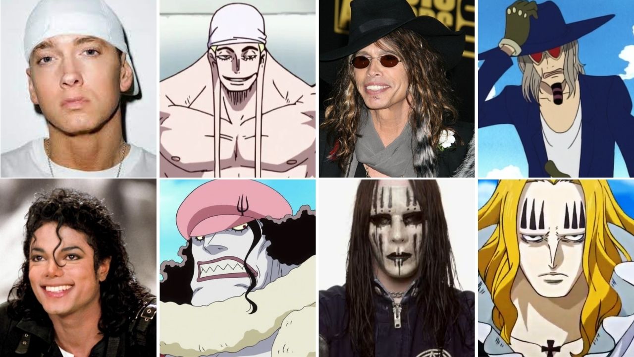 Del ambito musical el creador del manga eligió plasmar en su obra a Eminem como el Dios Enel, Steven Tyler como Jango quien tiene elementos alusivos a Michael Jackson en sus pasos de baile, otro que se asemeja al rey del pop es el gyojin Hody Jones. También Joely Jordison como Basil Hawkins, Lenny Kravitz inspiró a Mr.5, Stevie Ray Vaughan a Ace, Twiggy a Miss Valentine y Daft Punk a Killer.