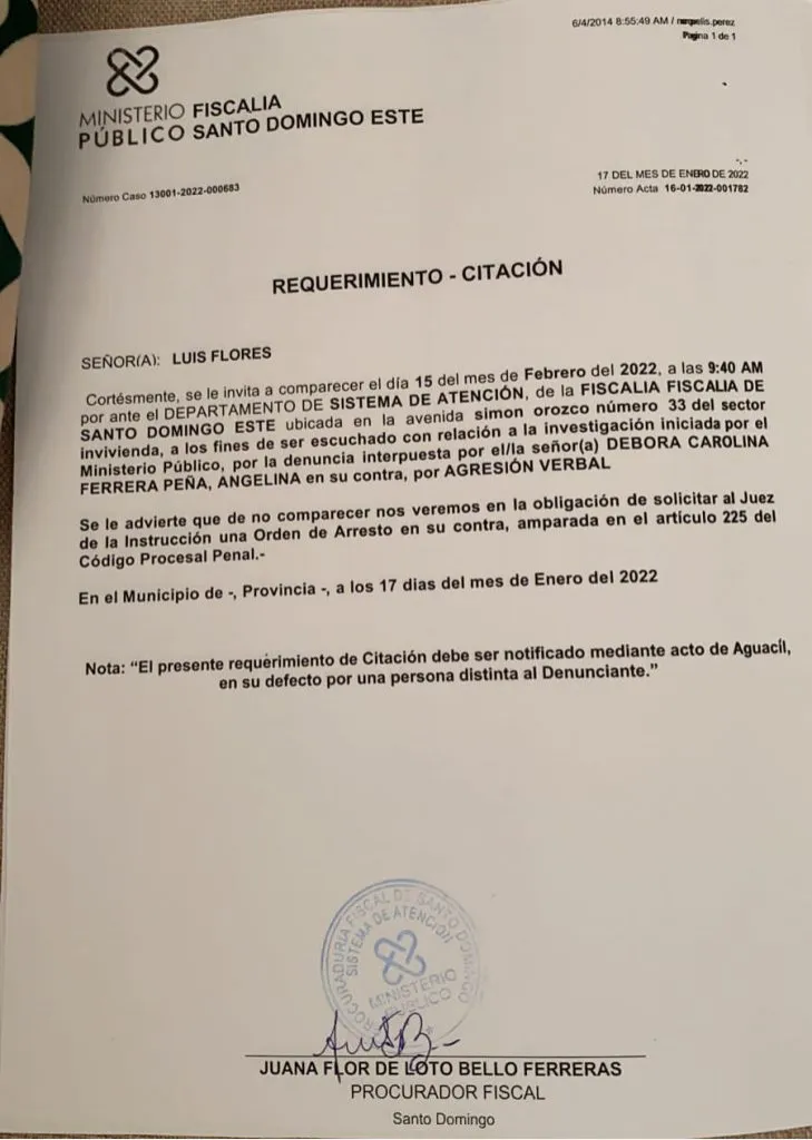 SANTO DOMINGO.- La Fiscalía de Santo Domingo Este invitó a comparecer para el 15 de febrero del año en curso al regidor por la Fuerza del Pueblo, Luis Flores con respecto al enfrentamiento que tuvo con la secretaria jurídica del Ayuntamiento de esta demarcación, Debora Ferrera Peña.