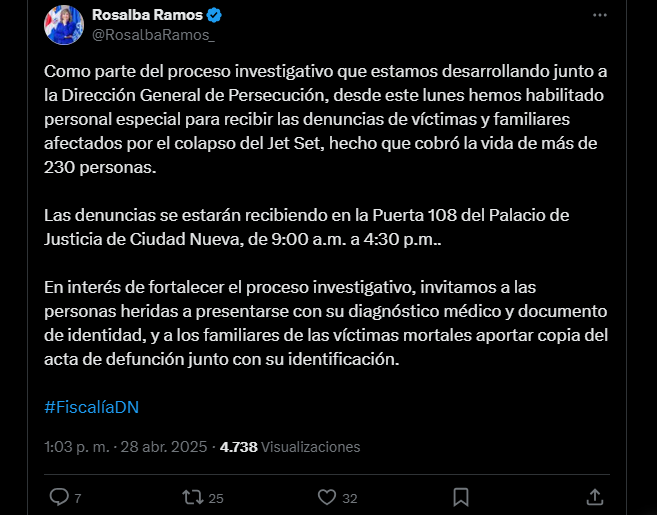 Ciudad Nueva, Distrito Nacional.– Ciudad Nueva, Distrito Nacional .- La fiscal Rosalba Ramos anunció que, a partir de este lunes, se ha habilitado personal especial para recibir las denuncias de víctimas y familiares afectados por el colapso del centro de eventos Jet Set, tragedia que cobró la vida de más de 230 personas. La magistrada dio a conocer esta información a través de una publicación en su cuenta de la red social X (anteriormente Twitter).