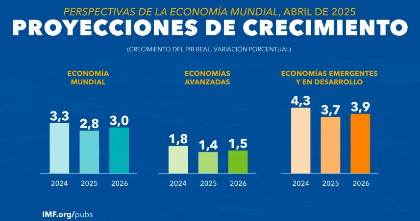 Para los mercados emergentes y economías en desarrollo, el FMI prevé una caída respectiva de 0.5 y 0.4 puntos, hasta el 3.7 % y el 3.9 %, respectivamente, este año y el siguiente, y para Latinoamérica y el Caribe se anticipa una rebaja respecto a enero de 0.5 puntos en 2025 (hasta el 2 %) y de 0.3 para 2026 (2.4 %).