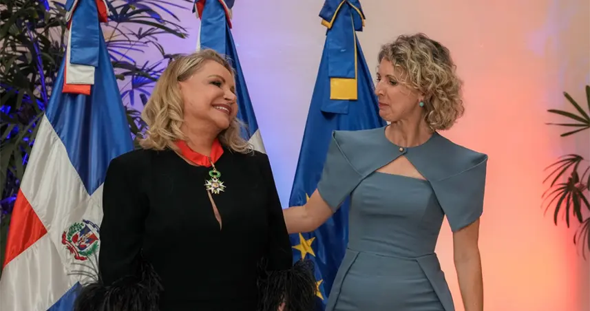 La señora Sonia Barbry, Embajadora de Francia ante la República Dominicana, en nombre del presidente Emmanuel Macron, impuso la condecoración a la embajadora Hernández de Grullón durante una ceremonia celebrada el 18 de septiembre en la Residencia de Francia en Santo Domingo.