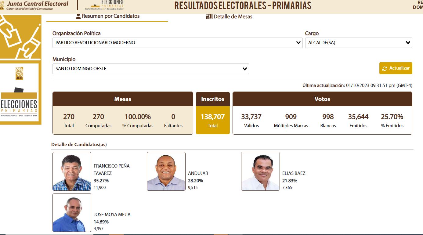 Según el reporte de la Junta Central Electoral (JCE) sobre las primarias internas indica que Peña obtuvo 11, 900 votos, para un 35.27%, frente a los 9,515 votos del actual alcalde de esa demarcación, José Andujar.