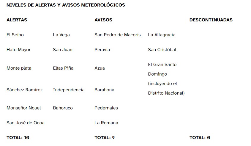 "Entre las provincias más relevantes se encuentran: La Altagracia, El Seibo, Hato Mayor, Monte Plata, Sánchez Ramírez, Monseñor Nouel, La Vega, Santiago, La Romana, San Pedro de Macorís, Gran Santo Domingo, San Cristóbal, Peravia, Azua, Barahona, Pedernales, San Juan, Independencia, Bahoruco y Elías Piña", indica el informe del tiempo.