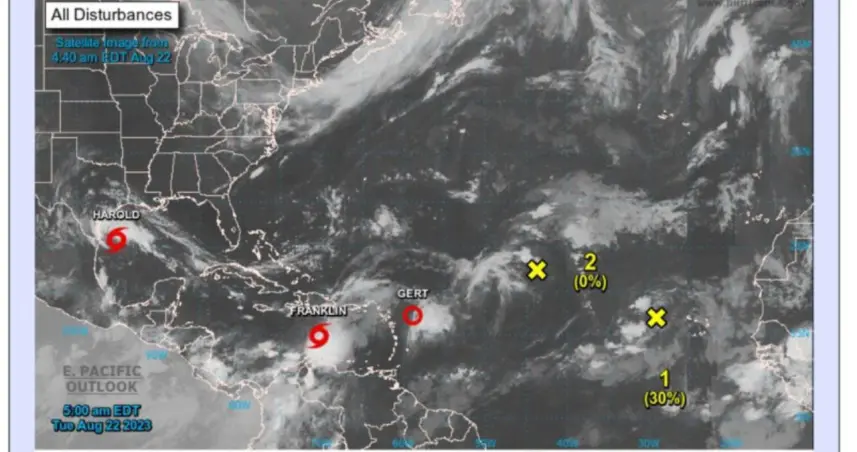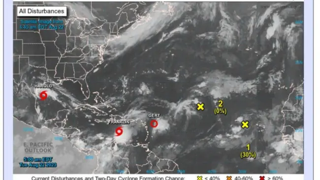 Se informa que la depresión tropical Gert se localiza a unos 470 kilómetros al este/sureste de las isla de sotavento, posee vientos máximos sostenidos de 45 kph, y avanza hacia el oeste/noroeste a 13 km/h. La ONAMET también monitorea a la tormenta tropical Harold ubicada a unos 245 kilómetros al este/sureste de Mansfield Texas, posee vientos máximos sostenido de hasta 75 km/h y se desplaza rápidamente al oeste/noroeste a 30km/h. Por último, informamos sobre dos áreas de aguaceros y tormentas eléctricas asociada a una onda tropical con probabilidades bajas de convertirse en ciclón tropical en las próximas 48 horas.