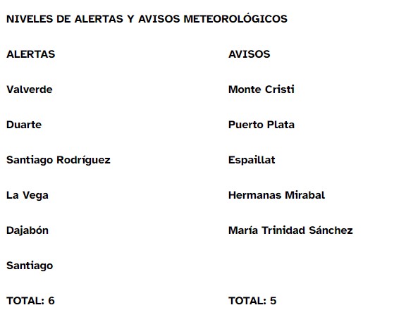 El reporte de meteorología indica que las provincias donde habrá más precipitaciones son Montecristi, Dajabón, Santiago Rodríguez, Valverde, Puerto Plata, Espaillat, Hermanas Mirabal, María Trinidad Sánchez, Duarte, Samaná, Sánchez Ramírez, La Vega, Monseñor Nouel y expandiéndose en horas de la tarde hacia San José de Ocoa, Azua, San Juan, Barahona, Pedernales, Peravia, San Cristóbal, Monte Plata, el Gran Santo Domingo y el Distrito Nacional, San Pedro de Macorís, Hato Mayor, El Seibo y La Altagracia.
