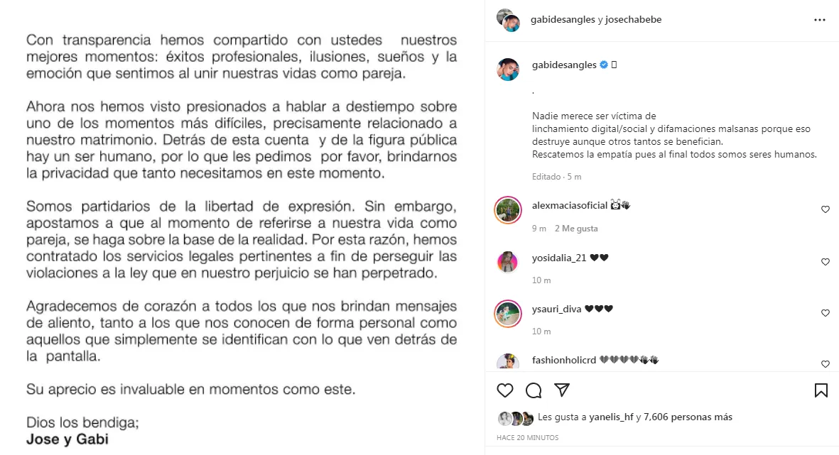 Tras varios días de estar en la palestra pública, siendo tendencia en redes sociales y blanco de críticas y especulaciones por rumores de un divorcio entre ellos ante una presunta infidelidad de parte de Gabi hacia su aún esposo, la pareja publica un mensaje a través de sus cuentas de instagram.