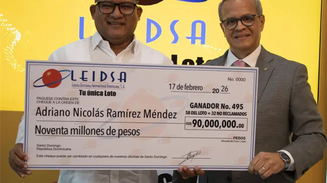 Santo Domingo.– La Lotería Electrónica Internacional Dominicana, S.A (LEIDSA) informó, que el Sr. Adriano Nicolas Ramírez Méndez, recibió el cheque 90 millones de pesos, monto que tenía el sorteo Loto del pasado sábado 24 de enero del 2026.