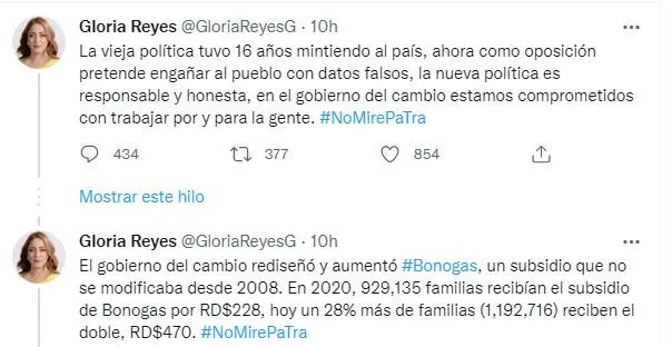 “El gobierno del cambio rediseñó y aumentó #Bonogas, un subsidio que no se modificaba desde 2008. En 2020, 929,135 familias recibían el subsidio de Bonogas por RD$228, hoy un 28% más de familias (1,192,716) reciben el doble, RD$470. #NoMirePaTra”, agregó.