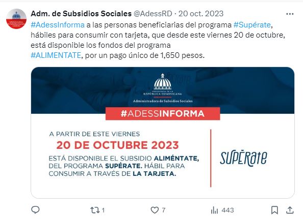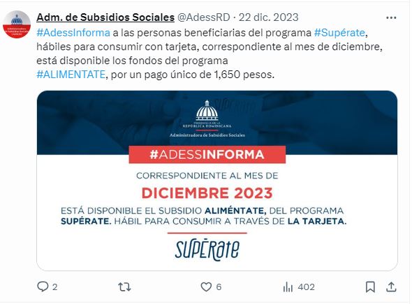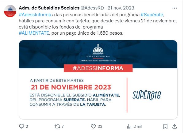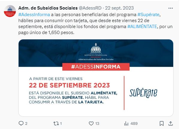 REDACCIÓN.– Redacción.- A tres días de celebrarse las elecciones municipales, la Administradora de Subsidios Sociales (ADESS), informó a las personas beneficiarias con la Tarjeta Supérate la disponibilidad de los fondos del programa Aliméntate con un monto de 1,650 pesos.