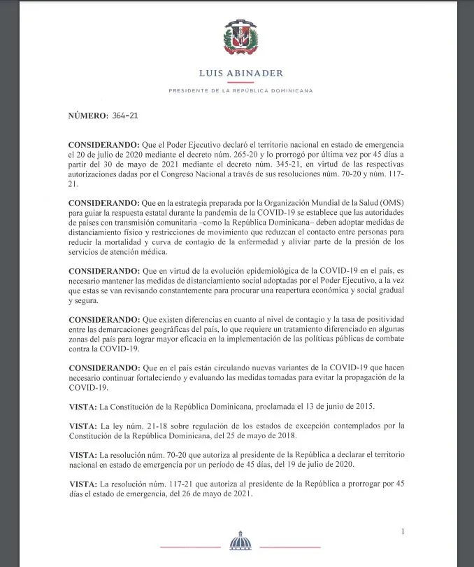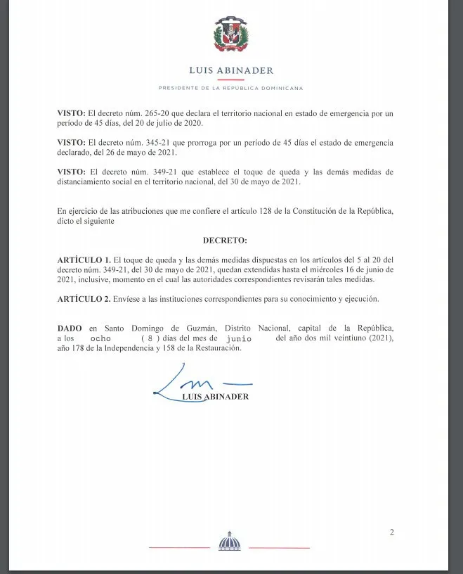 SANTO DOMINGO.- El presidente de la República, Luis Abinader, emitió un decreto que dispone que el toque de queda y las demás medidas dispuestas no variarán y quedan extendidas hasta el miércoles 16 de junio