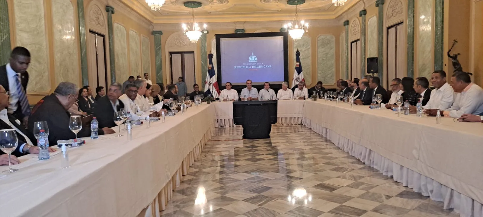 Durante la reunión que se prolongó por casi dos horas en el Salón Verde del Palacio Nacional, el mandatario Luis Abinader presentó un informe a los partidos políticos sobre las labores de reconstrucción que desarrolla el gobierno.