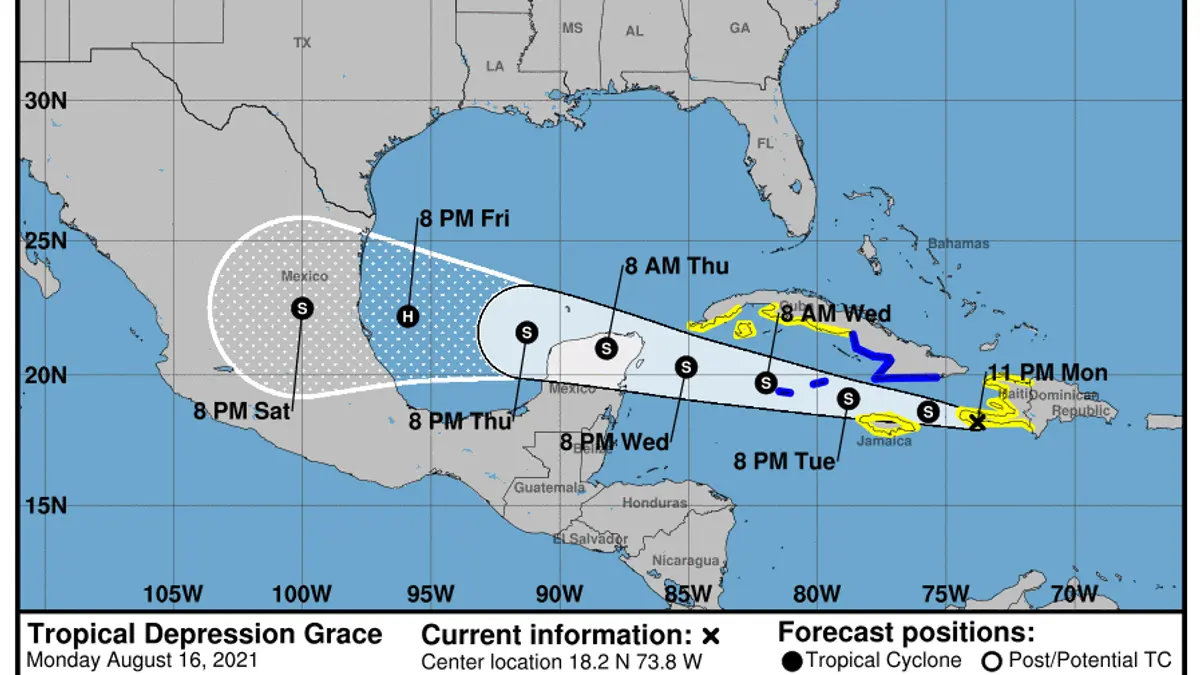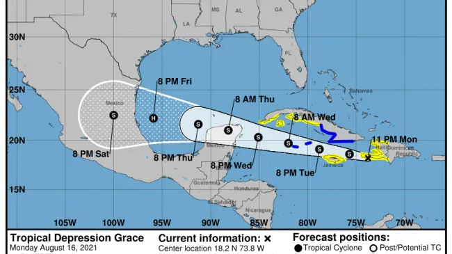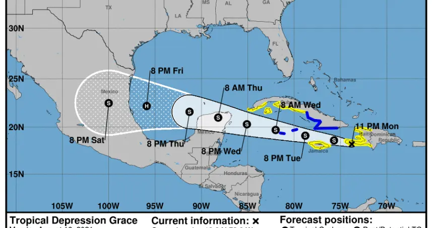 A las 11:00 de la noche, el centro de Tropical Depression Grace se encontraba cerca de la latitud 18,2 norte, longitud 73,8 oeste. El la depresión se mueve hacia el oeste cerca de 14 mph (22 km / h).