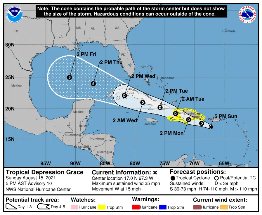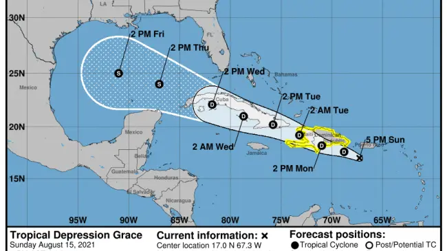 El la depresión se mueve hacia el oeste a cerca de 15 mph (24 km / h). A En general, se espera un movimiento hacia el oeste-noroeste durante los próximos días. En la pista pronosticada, Grace se moverá sobre Hispaniola en Lunes, cerca o sobre el este de Cuba el martes, y cerca o sobre el centro-oeste de Cuba el miércoles.