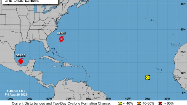 En tanto, Henri está a punto de convertirse en huracán con vientos máximos sostenidos de 70 mph (110 km/h) en su avance hacia la costa de Nueva Inglaterra.