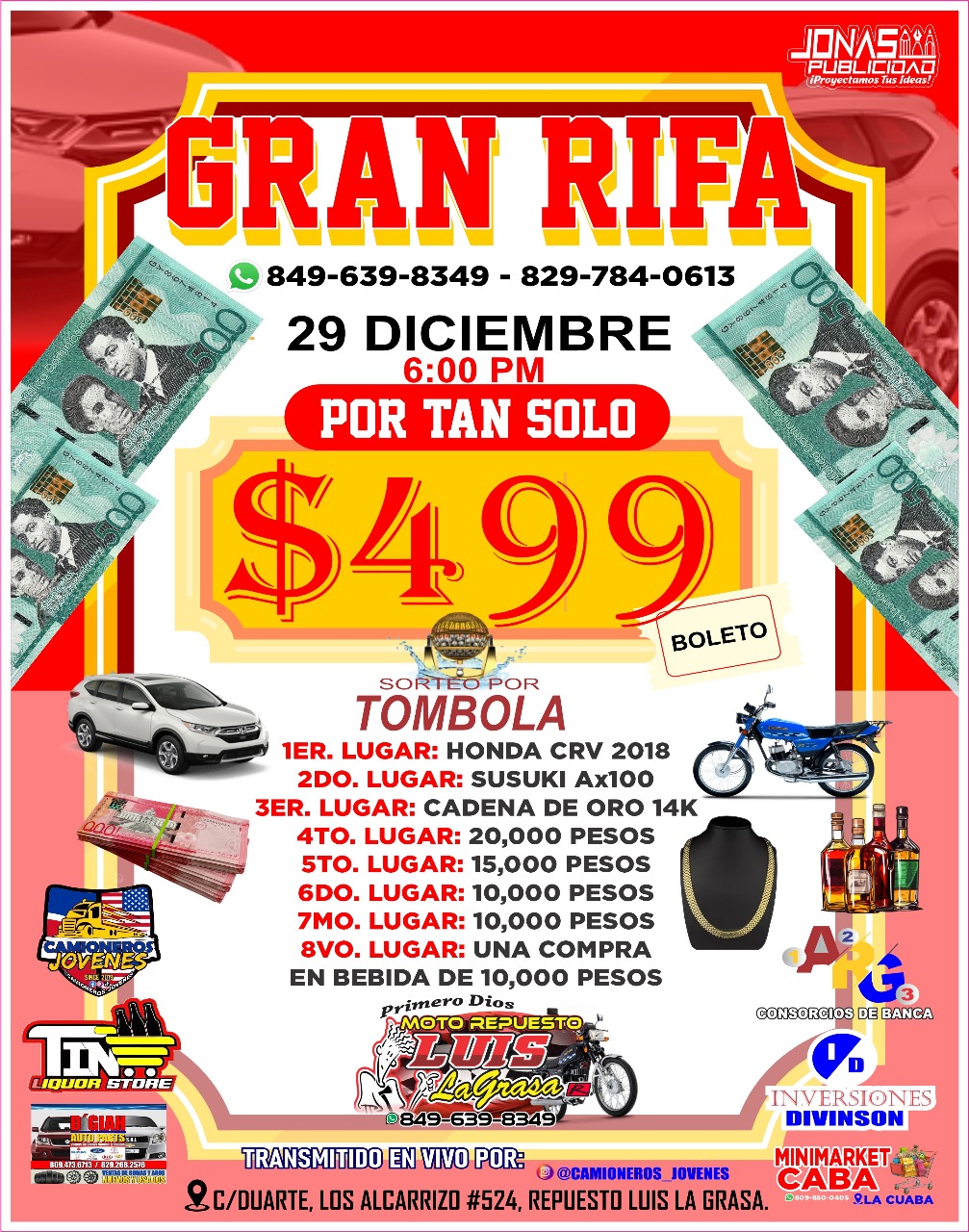 Los interesados en participar pueden comprar sus boletos para tener la oportunidad de ganar uno de estos fabulosos premios a través de los teléfonos 849-639-8349 y 829-784-0613.