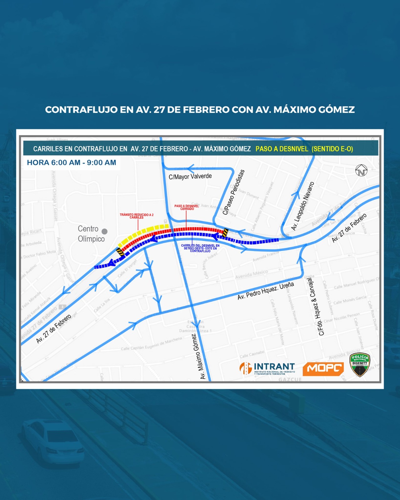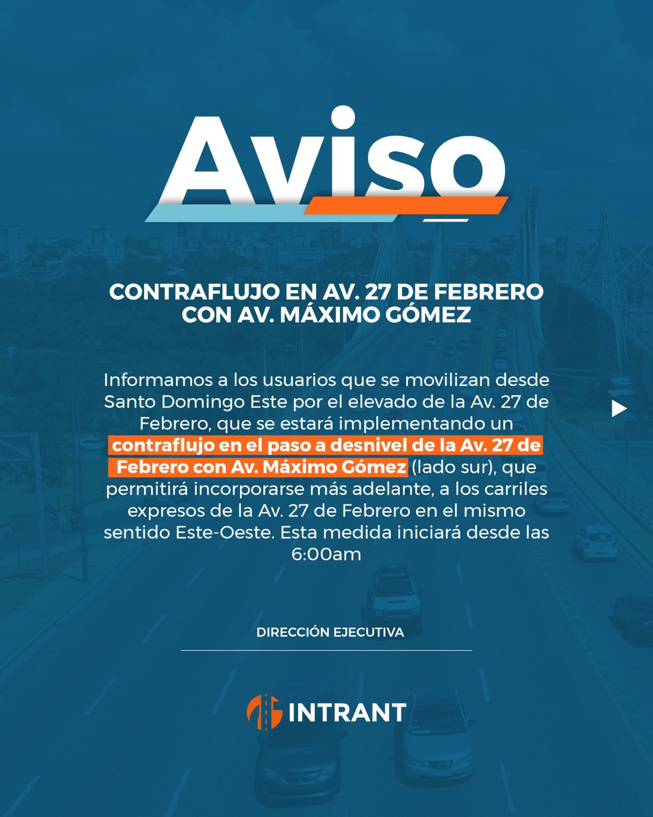 Santo Domingo.– SANTO DOMINGO.- El Instituto Nacional de Tránsito y Transporte Terrestre (INTRANT) informó a los ciudadanos que a partir de mañana miércoles 22 de noviembre, permitirán un contraflujo (Cambio en la dirección de algunas vías) en la avenida 27 de Febrero con avenida Máximo Gómez, a partir de las 6 de la mañana, con la finalidad de mejorar el tránsito.