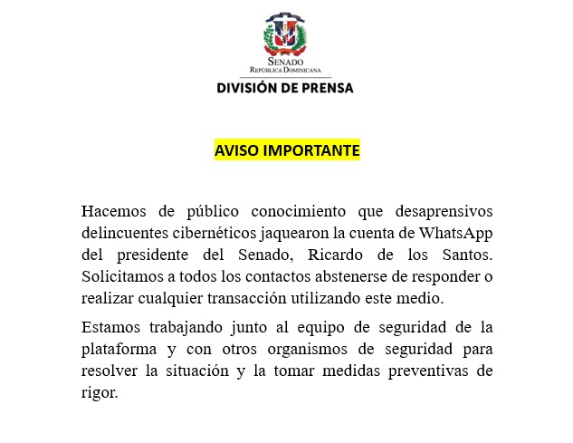 Santo Domingo.– Santo Domingo.-En un comunicado de prensa hacen de conocimiento público que este jueves hackearon el WhatsApp del presidente del Senado, Ricardo de los Santos.