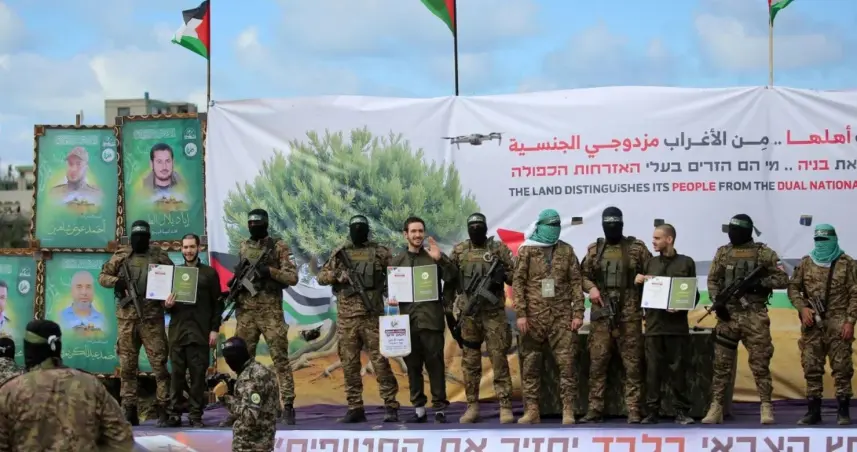 En Rafah (sur de Gaza), con rostro serio, Shoham y Mengistu pasaron por el escenario que los milicianos preparan semanalmente antes de subirse a las furgonetas que los llevarían con el Ejército israelí.