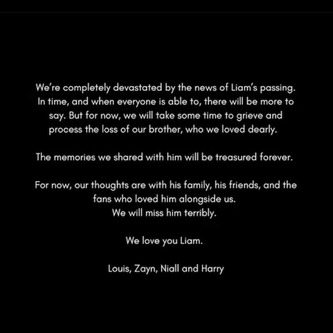 “Estamos completamente devastados por la noticia de la muerte de Liam. En su momento, y cuando todos seamos capaces de hacerlo, habrá más que decir. Pero por ahora, nos tomaremos un tiempo para llorar y procesar la pérdida de nuestro hermano, a quien queríamos profundamente. Las memorias que compartimos con él las atesoraremos por siempre. Por ahora, nuestros pensamientos están con su familia, sus amigos y los fanáticos que lo amaron junto con nosotros. Lo extrañaremos terriblemente. Te amamos Liam. Louis, Zayn, Niall y Harry”, se lee en el comunicado compartido por la banda.