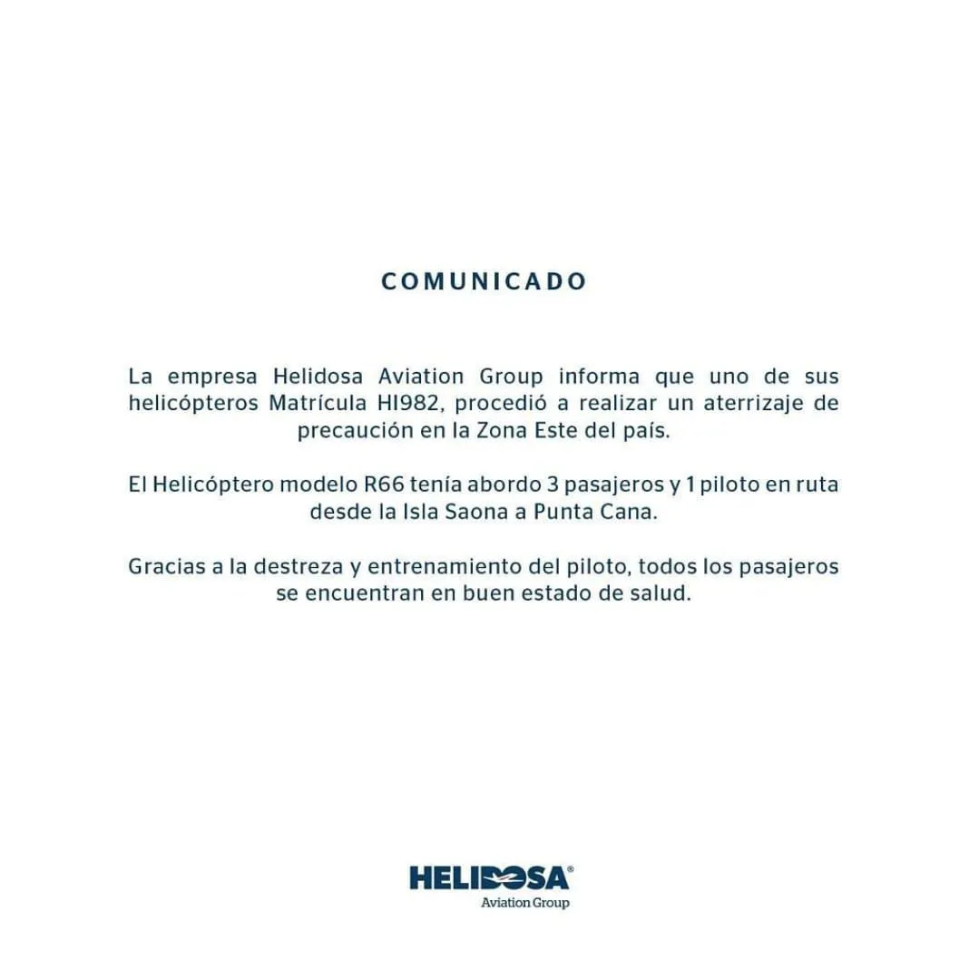 En un comunicado, la empresa dice que el helicóptero modelo R66 tenía abordo 3 pasajeros y 1 piloto en ruta desde la Isla Saona a Punta Cana.