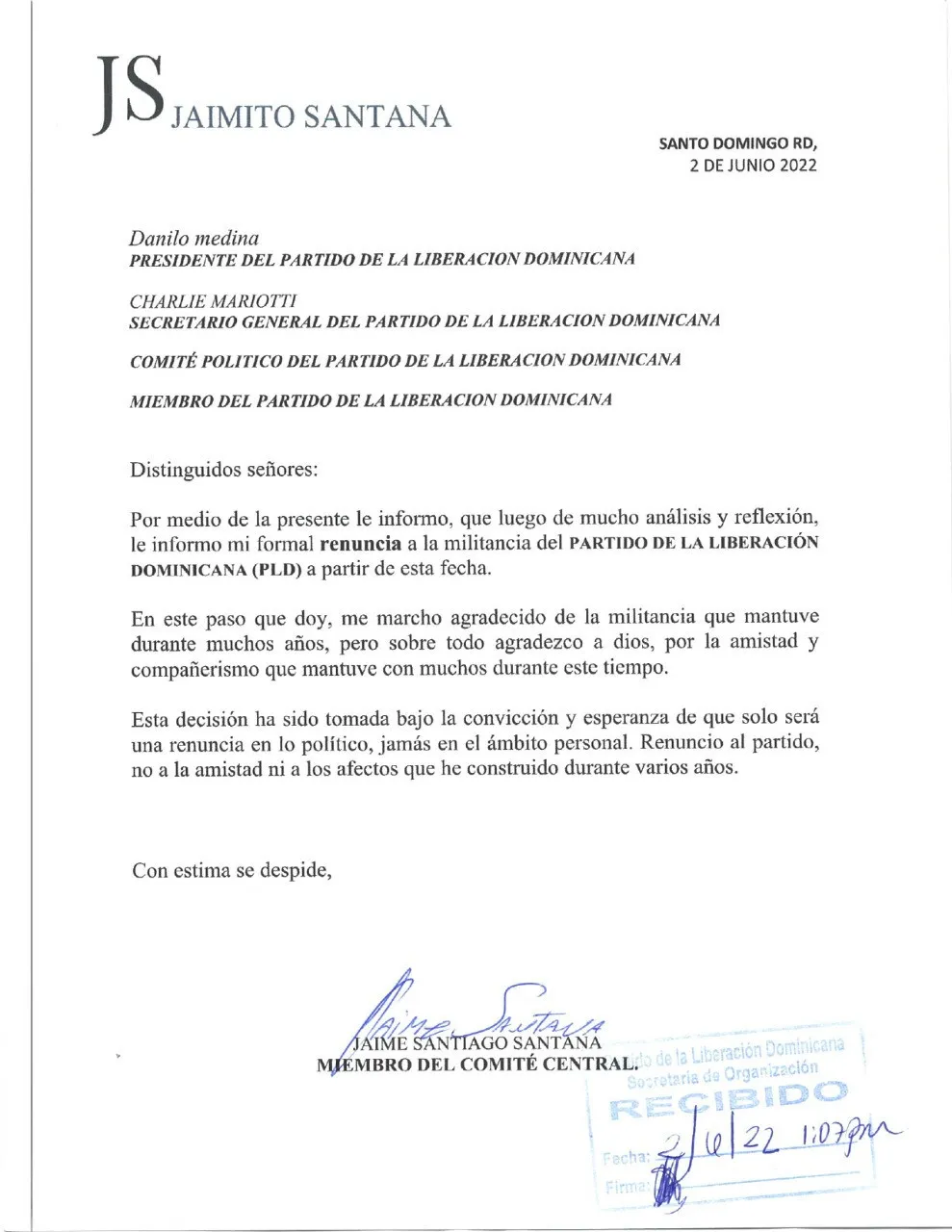SANTO DOMINGO.- En una carta dirigida al presidente del Partido de la Liberación Dominicana (PLD), Danilo Medina y al Secretario General Charlie Mariotti, presentó este jueves su formal renuncia de las filas de la organización morada el hijastro de la exsenadora Sonia Mateo.