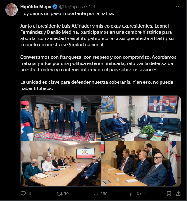 SANTO DOMINGO -.– SANTO DOMINGO. - El expresidente Hipólito Mejía calificó como un “paso importante por la patria” la reunión junto al presidente Luis Abinader y también los exmandatarios Leonel Fernández y Danilo Medina, en la que abordaron la crisis en Haití y su impacto en la seguridad nacional de la República Dominicana.