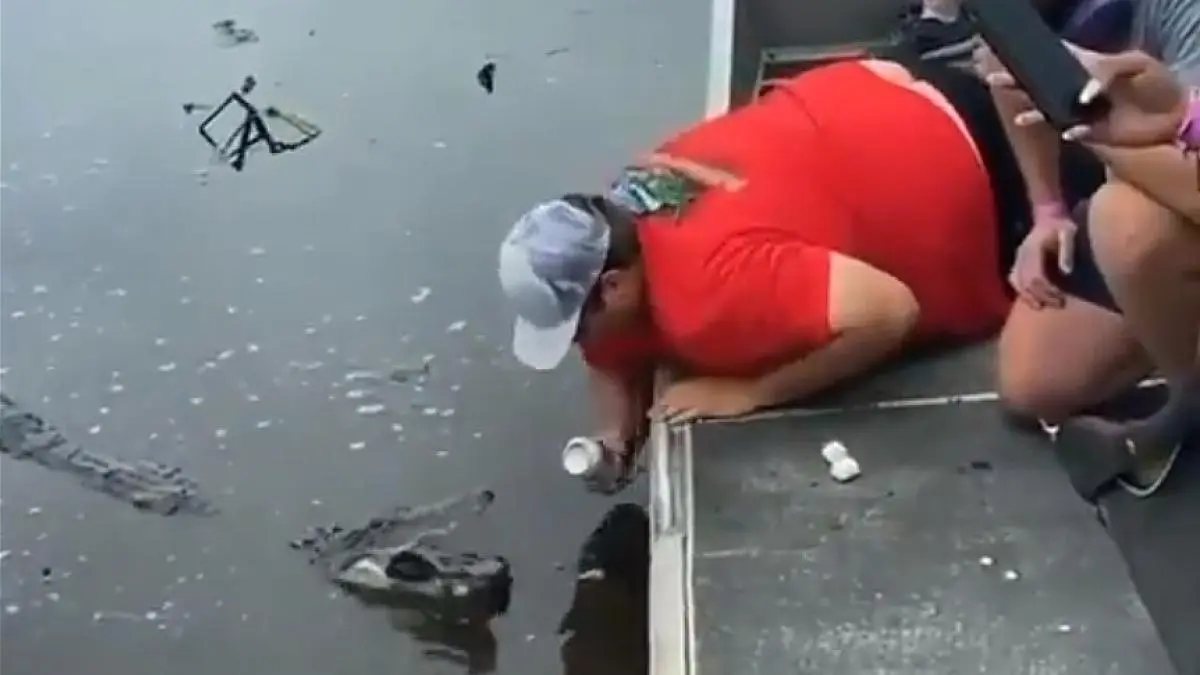 Hombre usa la boca de un caimán para abrir lata de cerveza