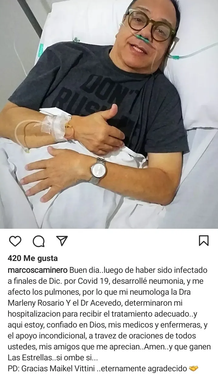 SANTO DOMINGO.- El merenguero Marcos Caminero se encuentra hospitalizado en un centro de salud por neumonía, la cual desarrolló tras estar infectado del COVID-19 el año pasado, según informaron los médicos, anunció el artista en su red social Instagram.