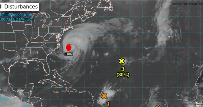 El NHC advirtió de que Erin, que llegó a ser categoría 5, "continuará produciendo corrientes de oleaje y marinas que amenazan la vida a lo largo de las playas de las Bahamas, gran parte de la costa este de los Estados Unidos, las Bermudas y el Atlántico de Canadá durante los próximos días".