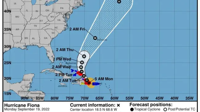 SANTO DOMINGO.- A las 5: 00 AM el centro del Huracán Fiona estaba localizado cerca de la latitud 18.5 norte, longitud 68.6 oeste. Se está moviendo hacia el noroeste a cerca de 8 mph (13 km/h) y se espera que este movimiento general continúe hasta esta noche, seguido de un giro hacia el norte-noroeste el martes y el norte el miércoles, de acuerdo con el Centro Nacional de Huracanes.