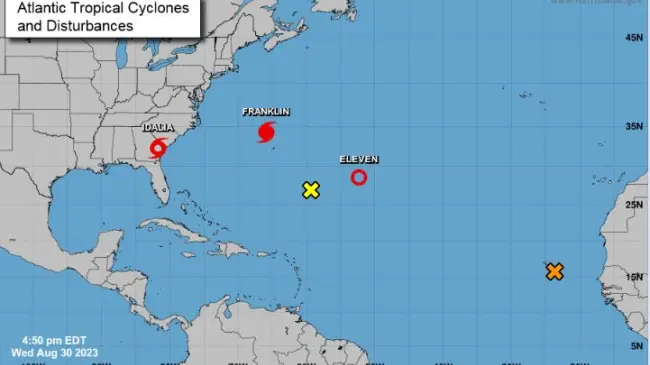 Por su parte, el poderoso huracán de categoría 4 Franklin, que se encuentra a 145 millas (235 km) al norte-noroeste de las Bermudas y se desplaza hacia el noreste, extiende "bandas de lluvia" sobre este territorio británico en el océano Atlántico Norte.