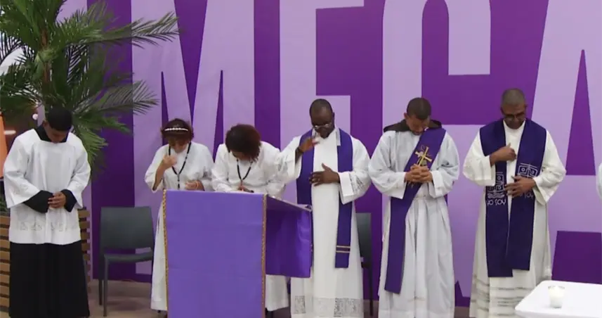 El obispo de la nueva diócesis Stella Maris de la provincia Santo Domingo, monseñor Manuel Ruiz, reunió a su feligresía en esta plaza comercial desde donde envió en mensaje de penitencia espiritual.