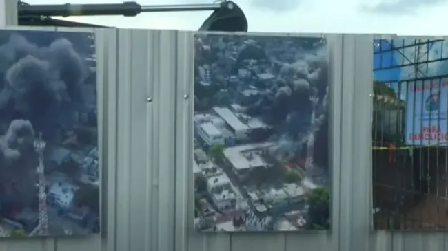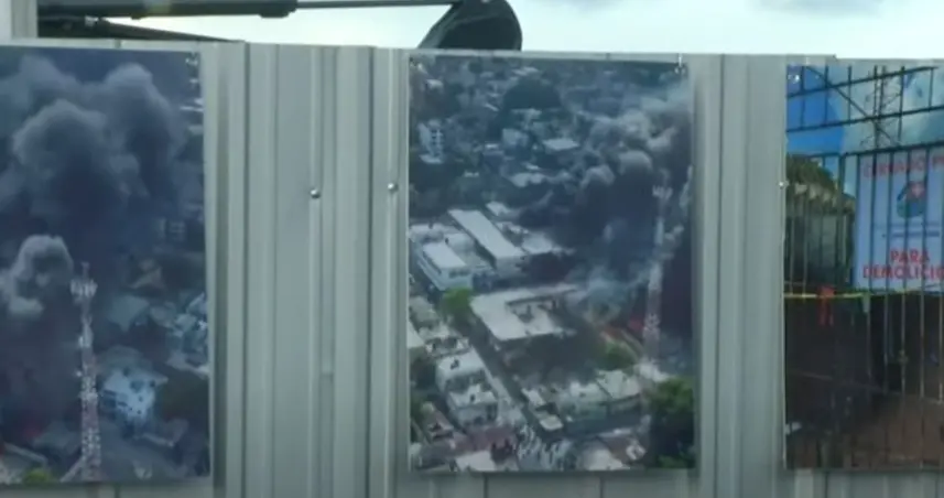 Una cerca que impide la visibilidad de la construcción que se realiza en el lugar del estallido es utilizada como galería, donde se exhiben imágenes del hecho y fotografías de los fallecidos.