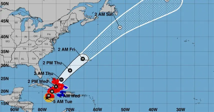 En su trayectoria prevista, el centro de Melissa impactará directamente sobre Jamaica hoy, con vientos catastróficos y que amenazan la vida, inundaciones y marejada; se desplazará por el sureste de Cuba el miércoles por la mañana y continuará hacia el sur y centro de Bahamas durante la jornada del miércoles.