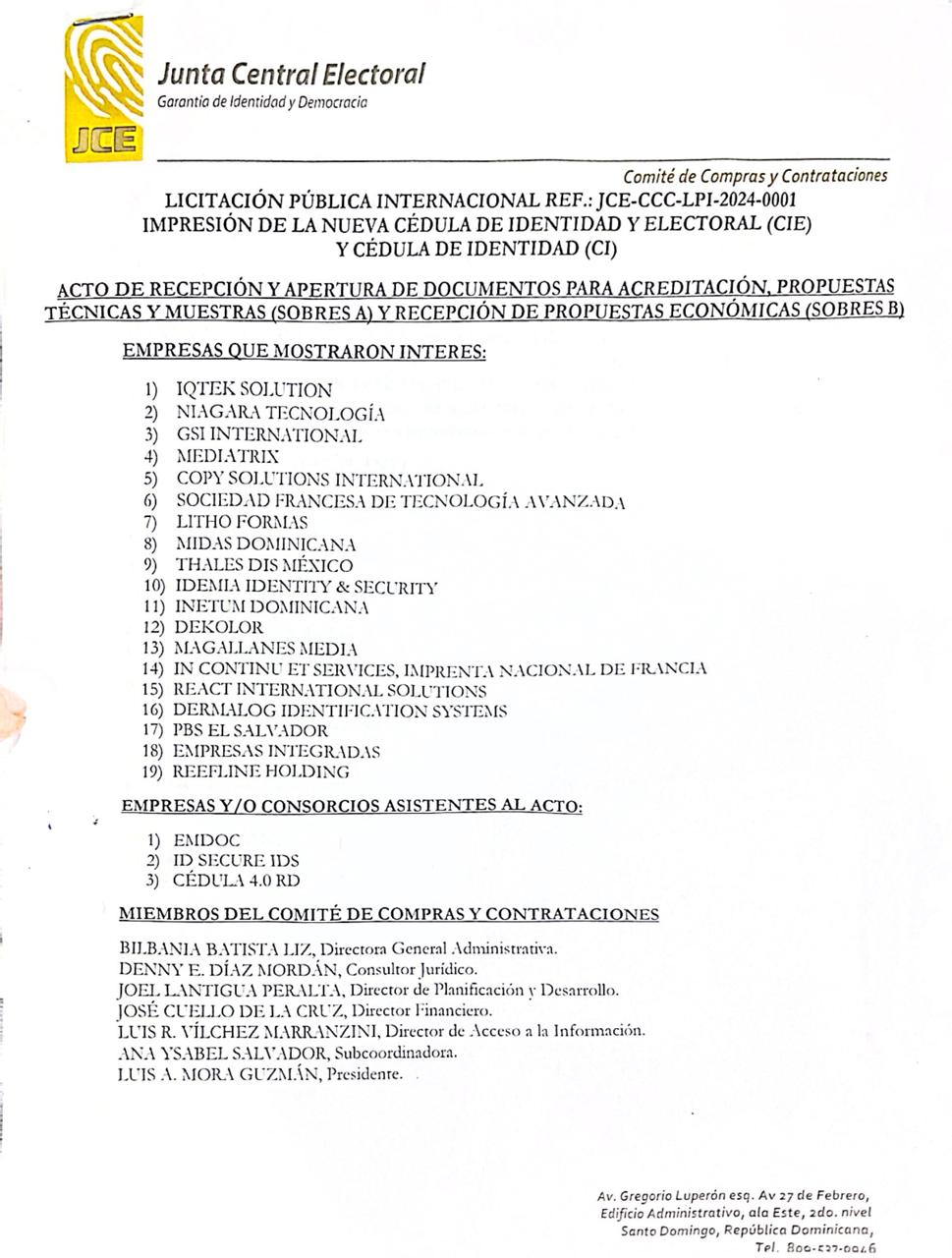 REDACCIÓN.– Redacción.- La Junta Central Electoral (JCE) inicia el proceso de licitación pública internacional para la impresión de la nueva cédula de identidad y electoral, para el cual se postularon 19 empresas interesadas.