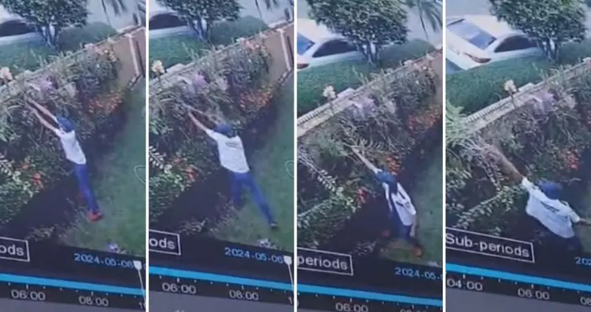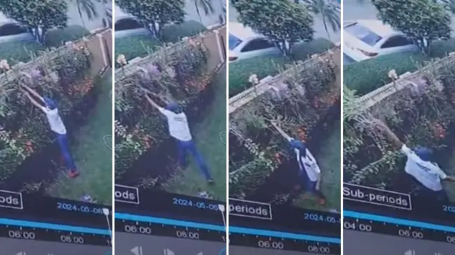 Las imágenes del hecho, captadas por una cámara de vigilancia, muestran como el hombre vestido con una especie de uniforme de personal de seguridad penetra en jardines en una residencia del sector y carga con un saco lleno de orquídeas mientras salta la cerca y sale caminando con toda normalidad.