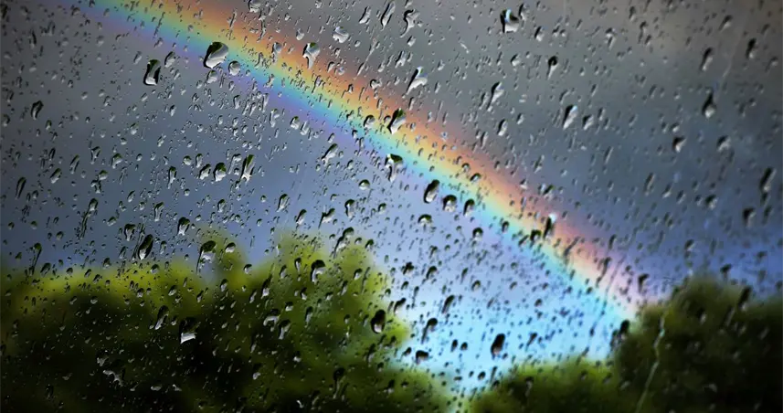La imagen muestra gotas de lluvia adheridas a un vidrio, probablemente una ventana, que distorsionan suavemente el paisaje exterior. Al fondo, un arcoíris se extiende en diagonal sobre un cielo aún nublado, mientras se distinguen árboles de un verde intenso ligeramente desenfocados.