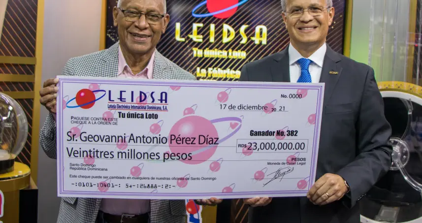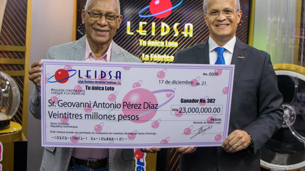 SANTO DOMINGO.- La Lotería Electrónica Internacional Dominicana, S.A. (LEIDSA), le entregó al señor Geovanni Ant. Pérez Díaz su premio de RD$23 millones de pesos, al acertar con los números ganadores en el sorteo correspondiente al pasado sábado 27 de noviembre del presente año.