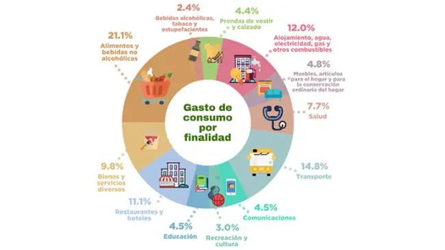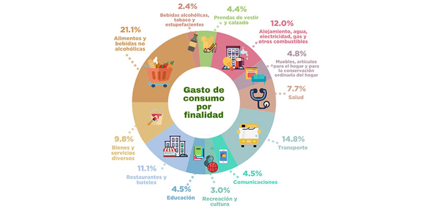 En la estructura del gasto de consumo para todo el país, la mayor participación se concentra en los alimentos y bebidas no alcohólicas (21.1%); siguiendo por importancia el transporte (14.8%); alojamiento, agua, electricidad, gas y otros combustibles (12.0%); restaurantes y hoteles (11.1%); bienes y servicios diversos (9.8%); salud (7.7%); muebles y artículos del hogar (4.8%), educación (4.5%) y comunicaciones (4.5%), entre otros.