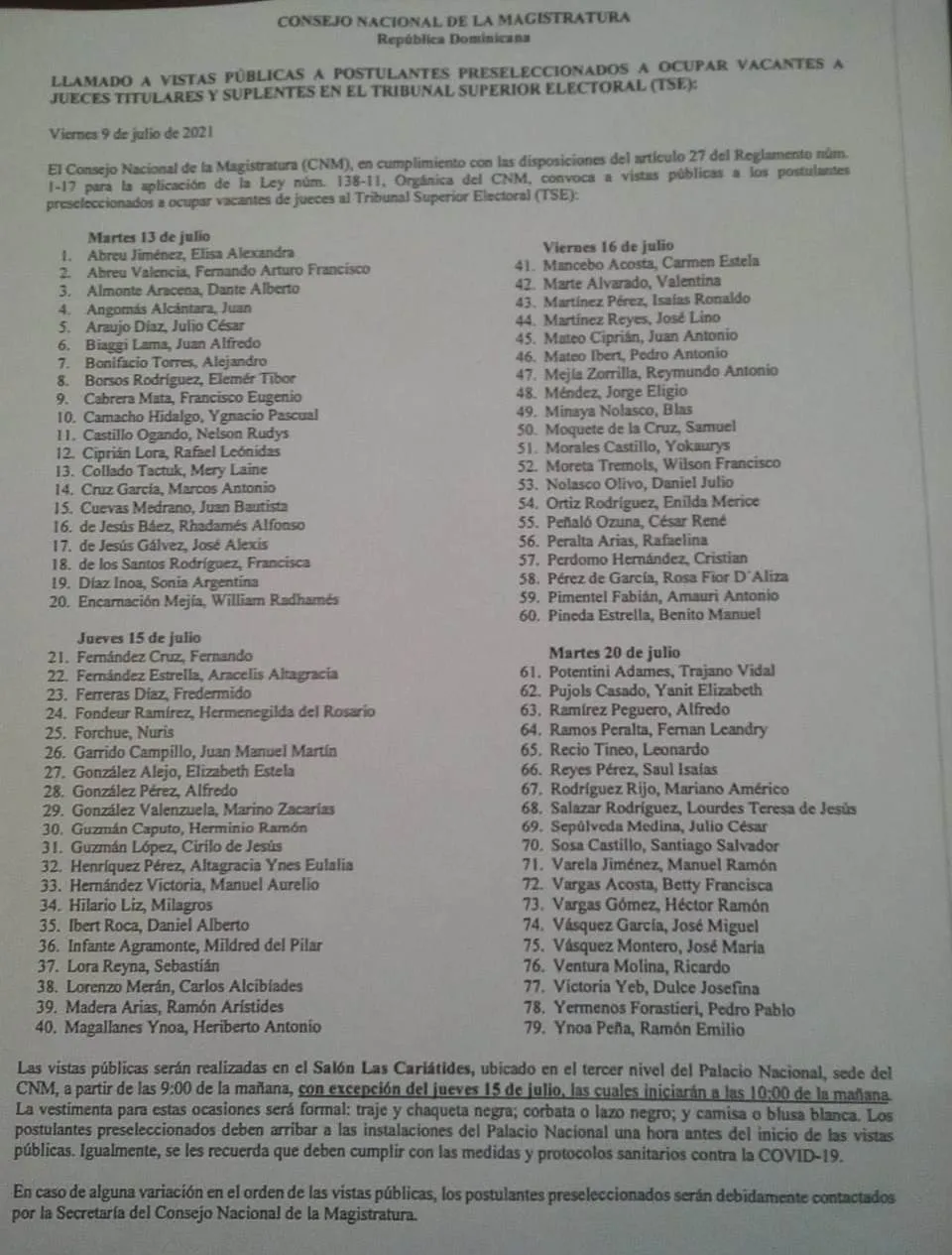 El Consejo Nacional de la Magistratura está compuesto por el presidente de la República Luis Abinader; el presidente de la Suprema Corte de Justicia (SCJ), Luis Henry Molina Peña; el presidente del Senado, Eduardo Estrella; el presidente de la Cámara de Diputados, Alfredo Pacheco; la procuradora general de la República, Miriam Germán Brito; Nancy Salcedo Fernández, miembro de la SCJ; el senador Bautista Rojas Gómez y el diputado Víctor Fadul.A continuación los postulantes: