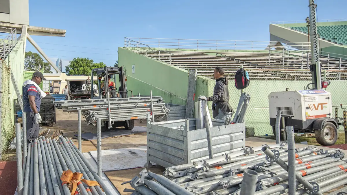 El montaje inició hace unos días y un equipo de profesionales trabaja arduamente para armar la que podría ser la tarima más imponente que se haya puesto en el Olímpico.