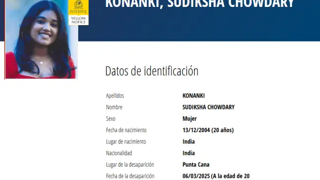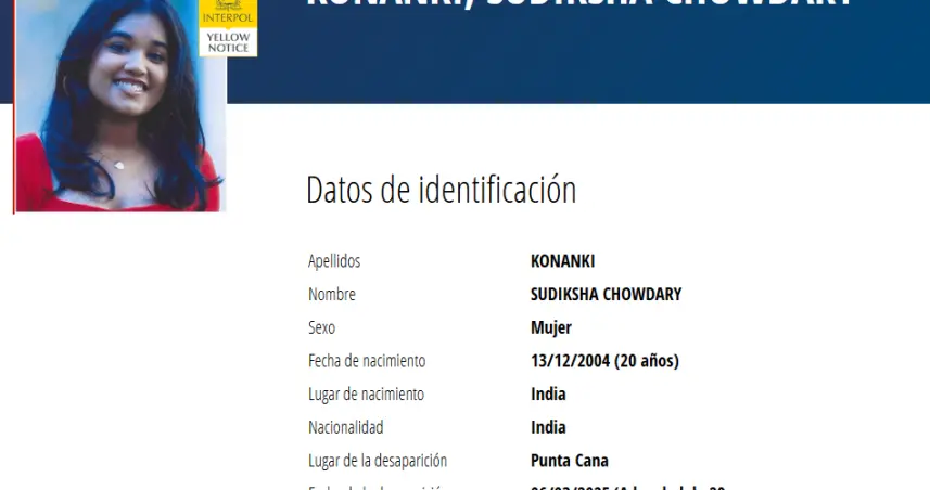 Santo Domingo.– Santo Domingo.- La Organización Internacional de Policía Criminal (Interpol) emitió este miércoles una notificación amarilla por la desaparición de Sudiksha Konanki, la estudiante en Estados Unidos de origen indio de 20 años que viajó a la República Dominicana para vacacionar con varios amigos.
