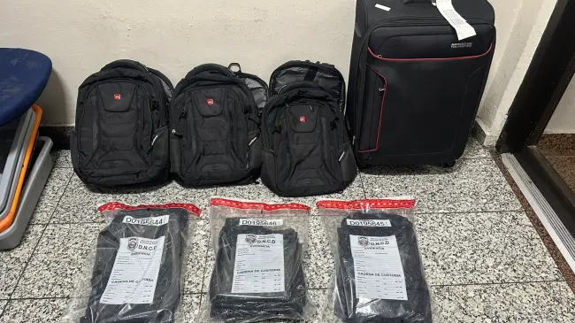 Dijo que por instrucciones del fiscal se procedió a abrir la maleta, en cuyo interior se ocuparon prendas de vestir y tres mochilas, con doble fondo conteniendo dentro las 11 láminas de la sustancia, con un peso superior a los (09) kilogramos.